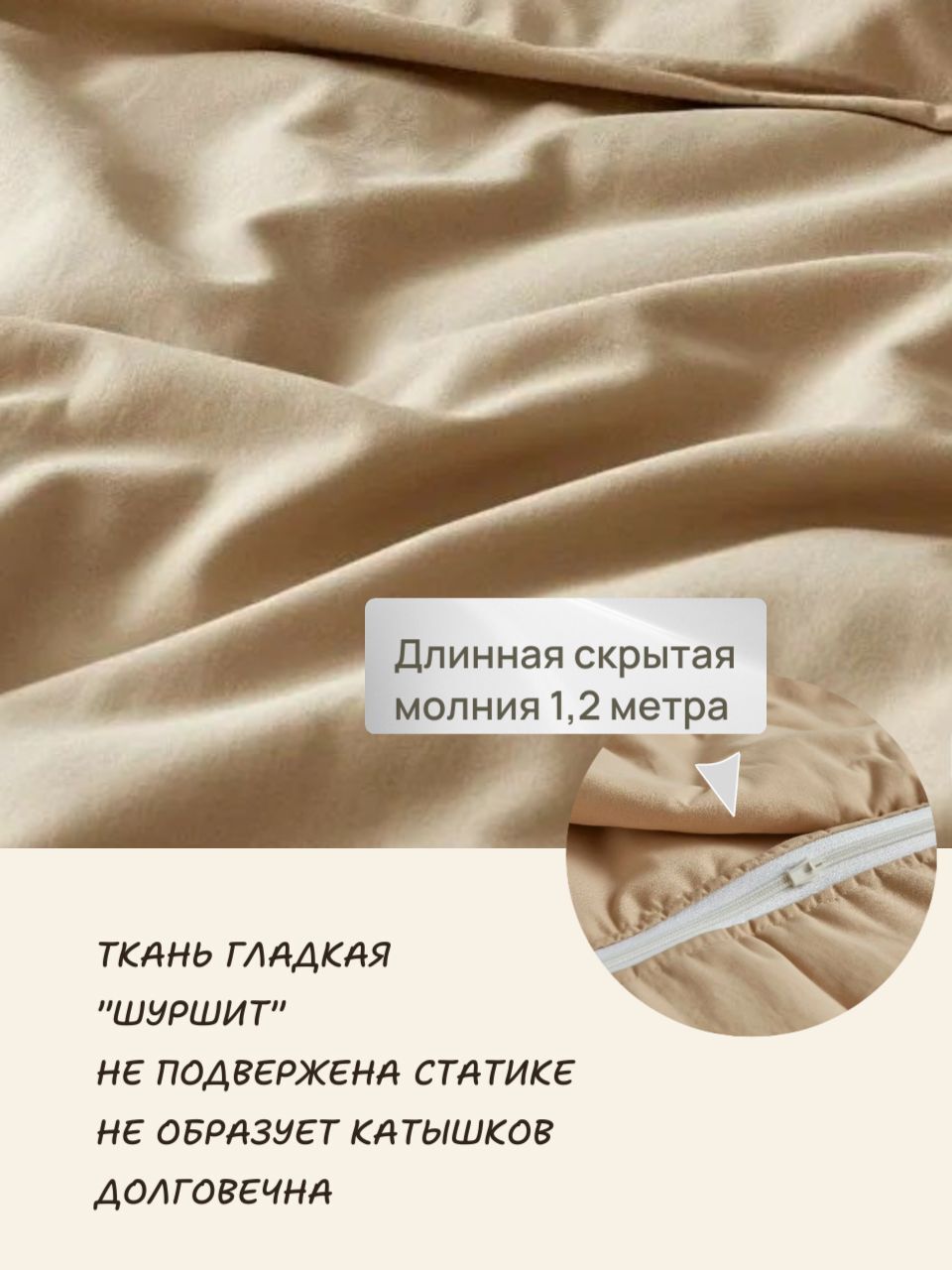 Удобная длинная скрытая молния 1,2 метра позволяет легко снимать и надевать наперник на одеяло. Размер отшивается с небольшим запасом, обеспечивает удобную посадку одеяла внутри наперника, не уменьшая его объем.