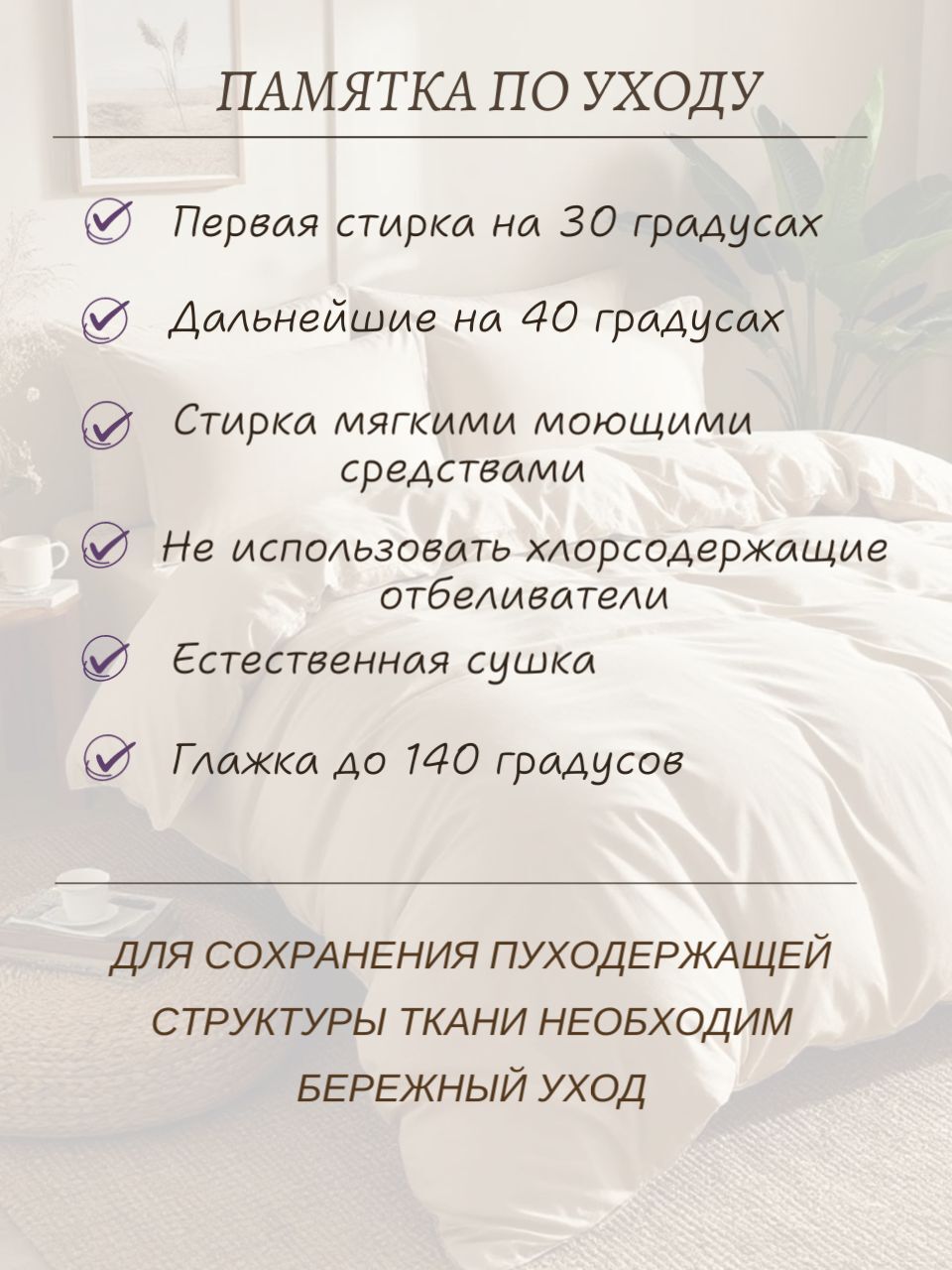 Для сохранения пуходержащей структуры ткани и целостности молнии, необходимо стирать изделие при температуре не более 40 градусов, сушка естественная. Первая стирка на 30 градусах. Не забывайте, что наперники Diego не предназначены для непосредственной набивки пуховым наполнителем, а служат как дополнительный чехол, обеспечивая долговечность и защиту Вашего одеяла.