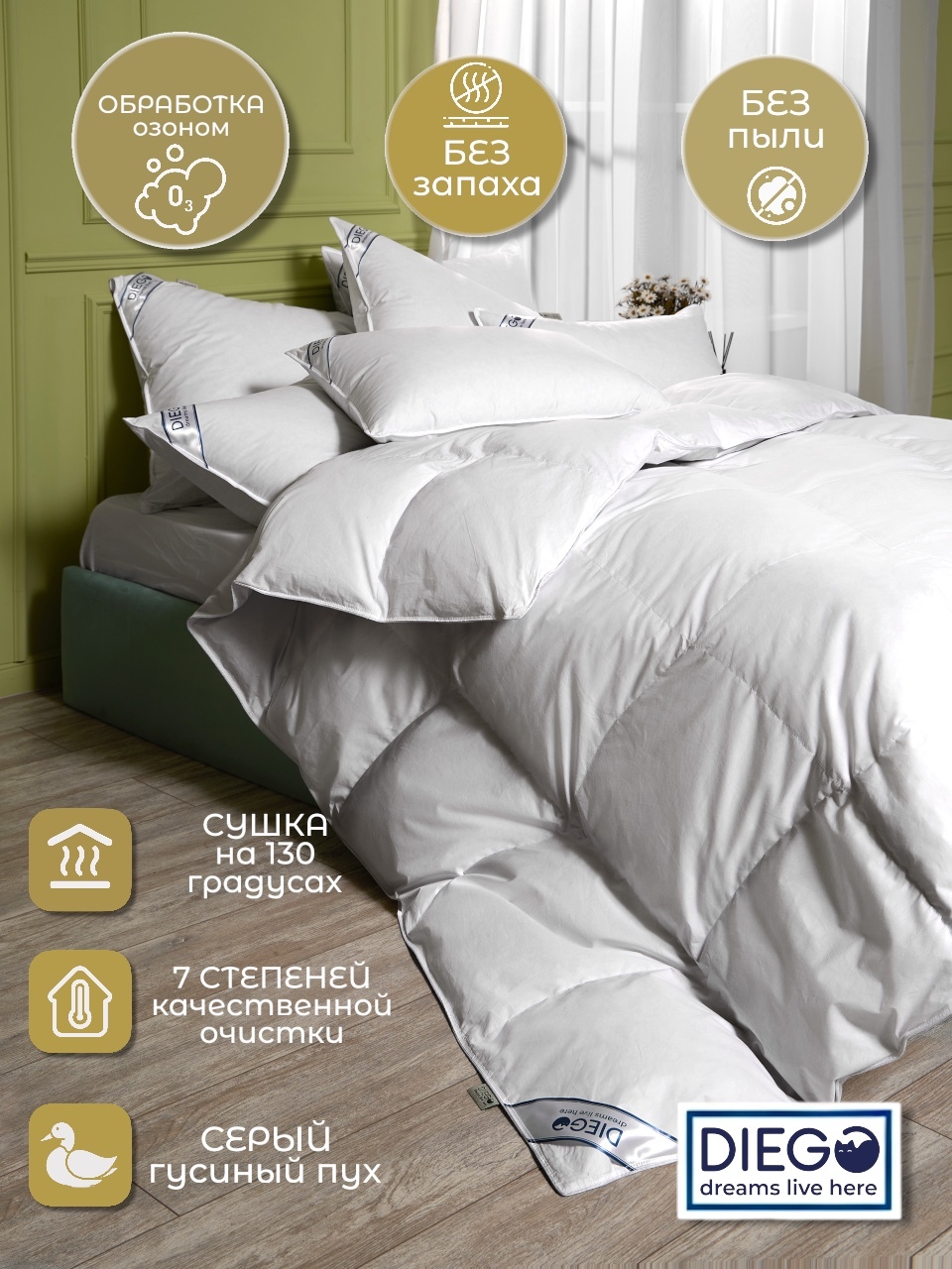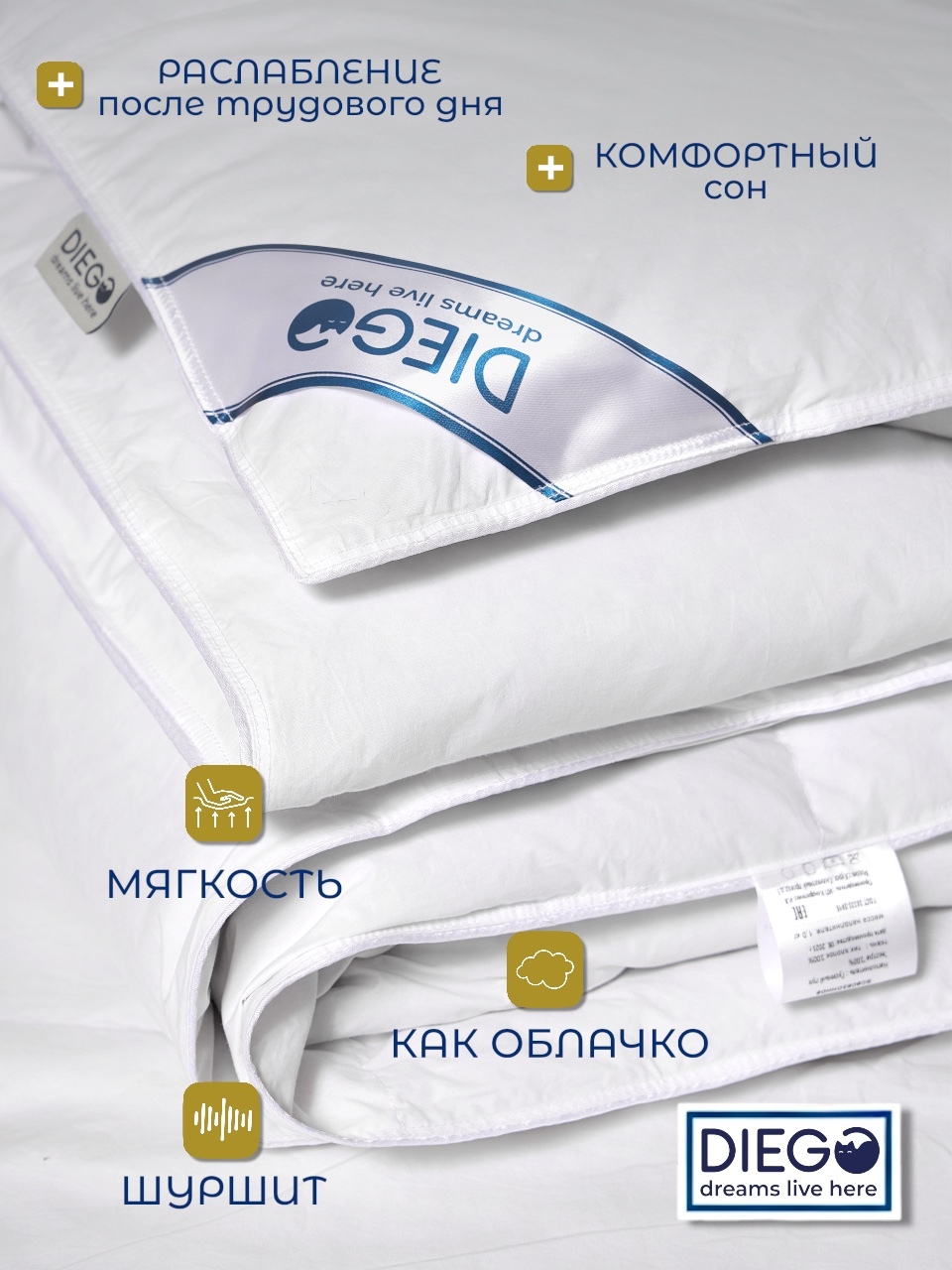 Одеяло «Диана» от Diego — лёгкое, пышное, натуральное и тёплое. Настоящий комфорт круглый год.