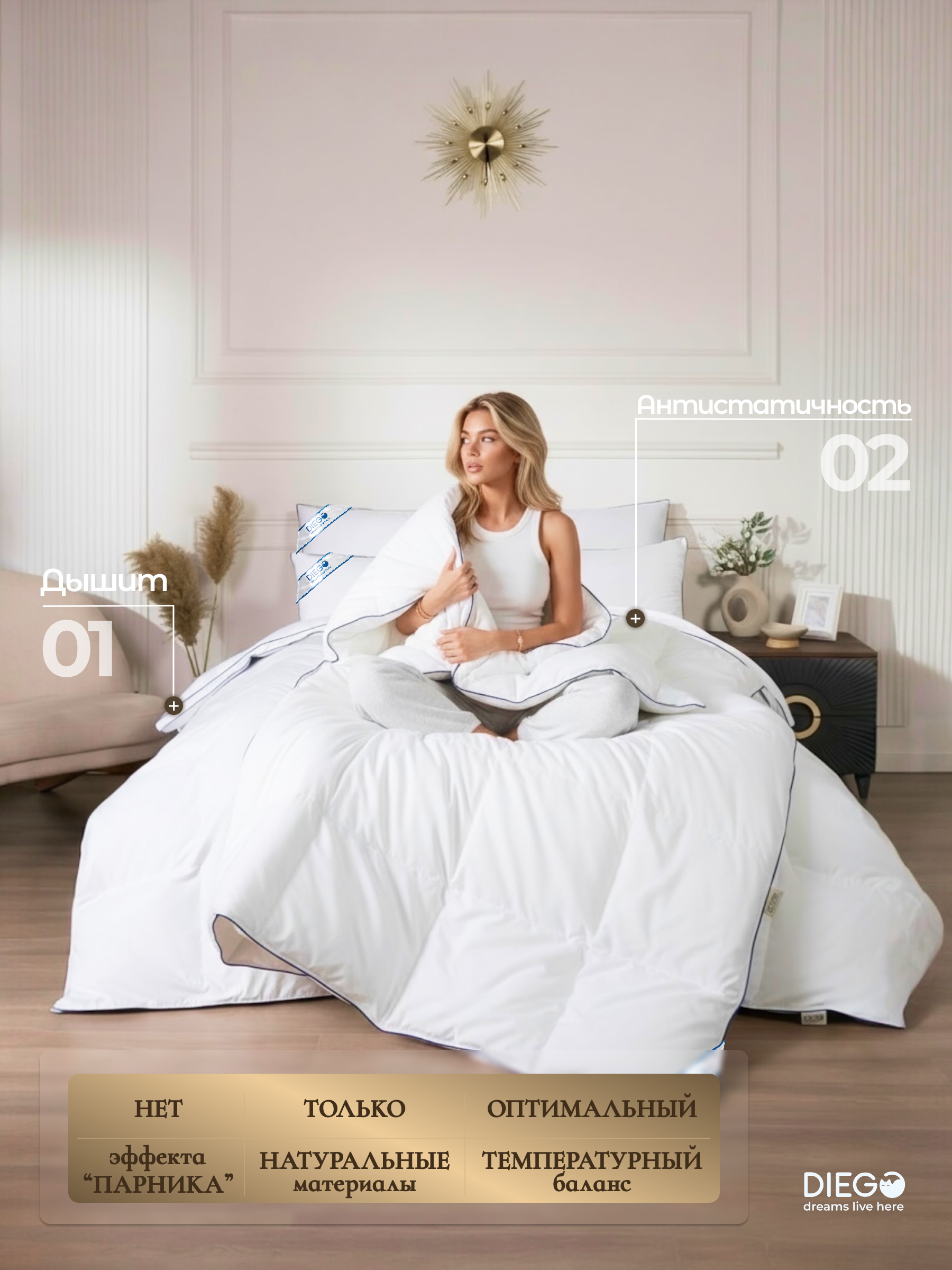 В составе — только натуральные, дышащие материалы, которые создают эффект сухого тепла и способствуют здоровому сну.