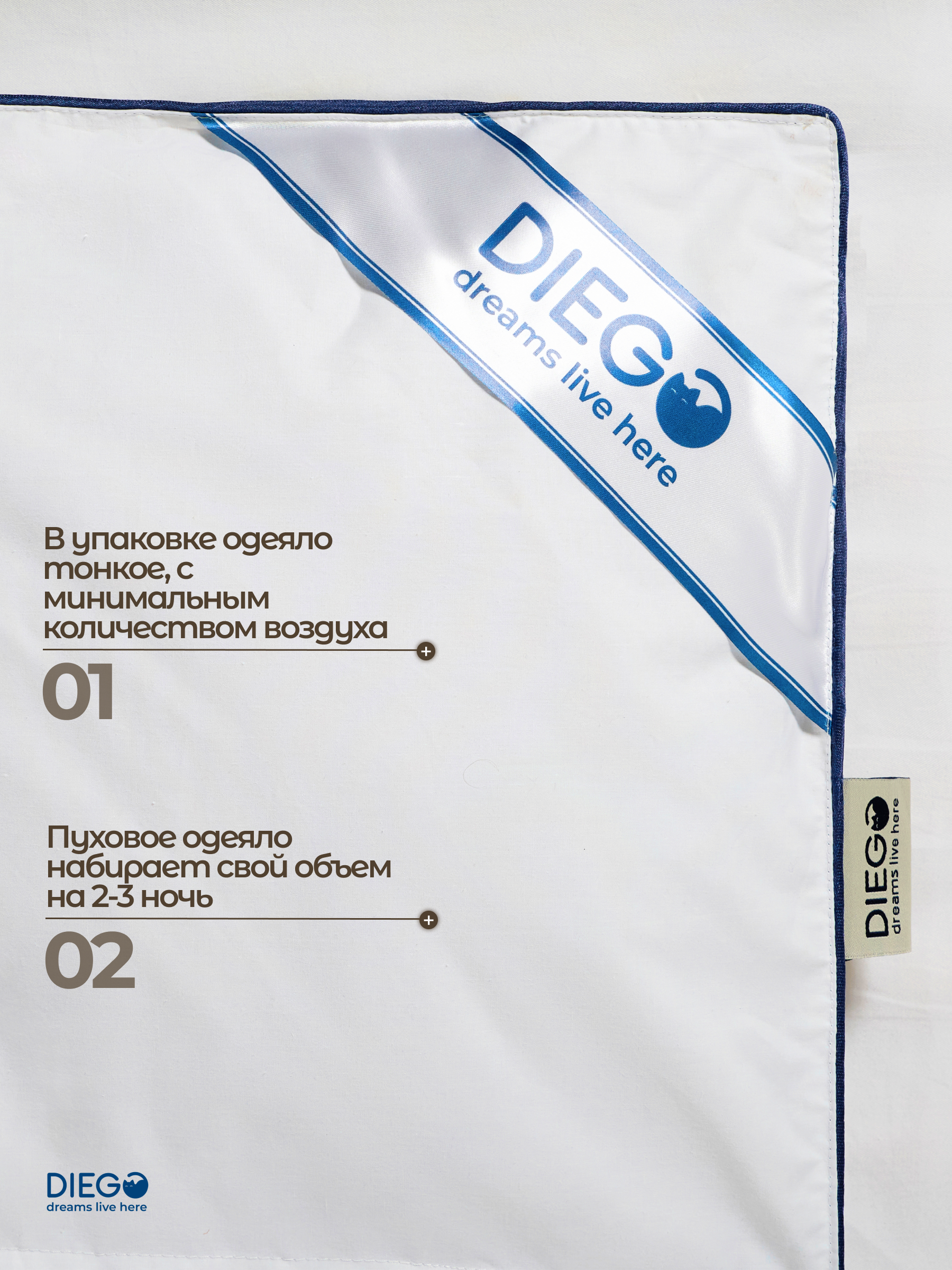 После распаковки встряхните одеяло и дайте ему «подышать» — пух расправится, и одеяло увеличится в объёме до 12 см в высоту.