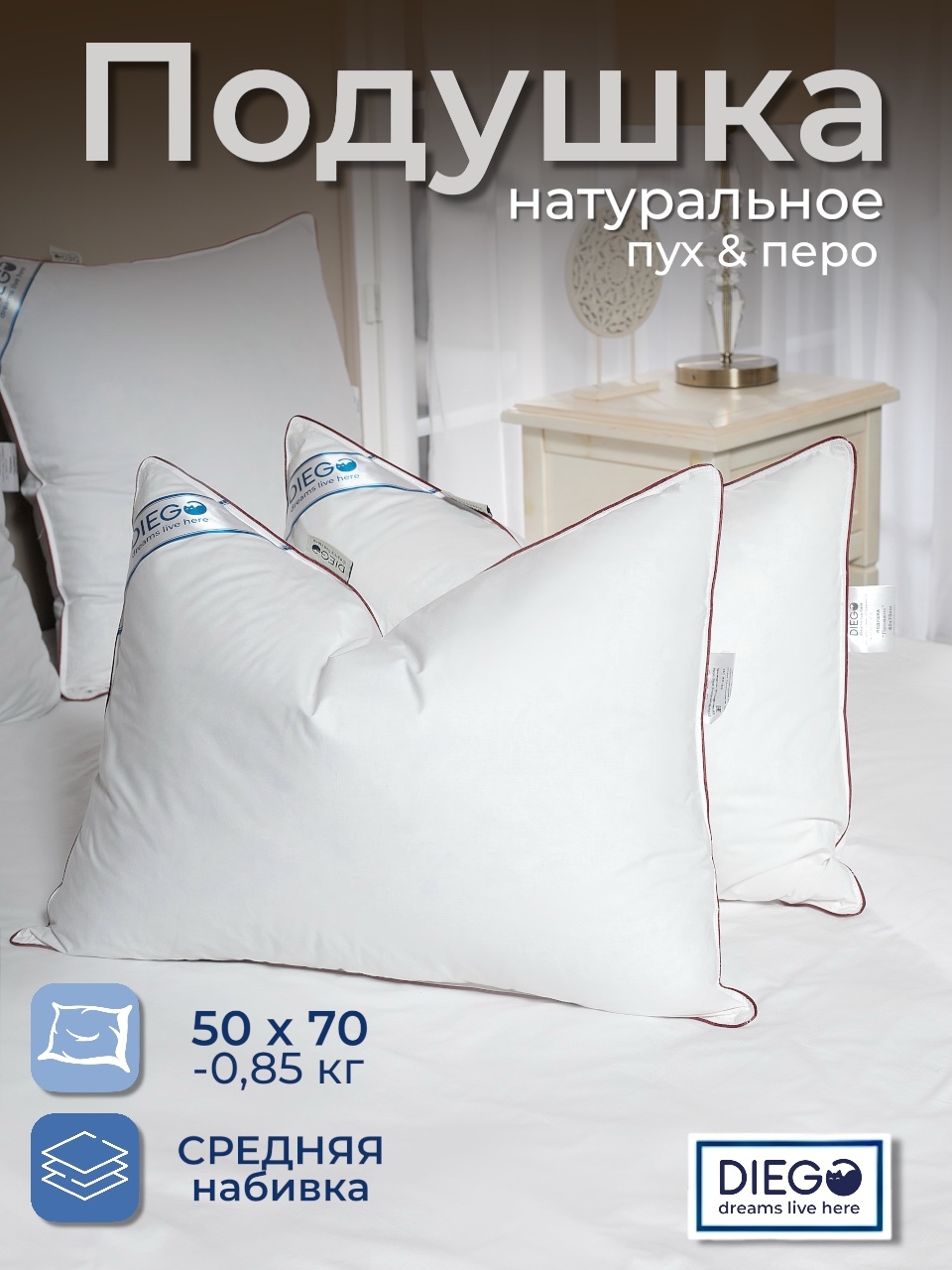 Вес пухо-перьевого наполнения в этой серии в размере 50х70 - 0,8 кг, а в размере 70*70 – 1,0 кг.