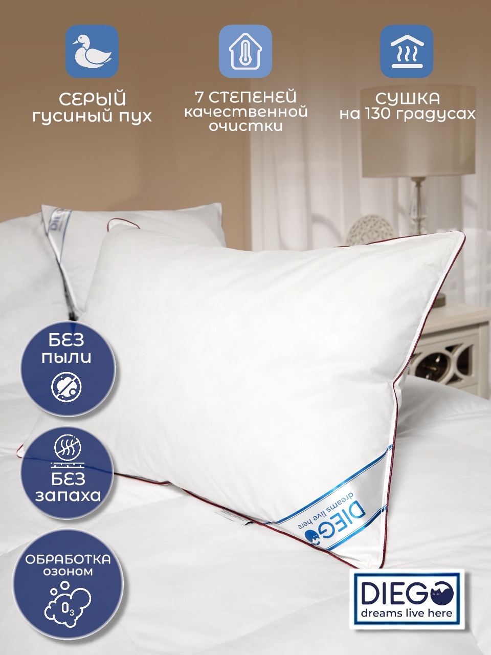 Хлопок гигроскопичен: он быстро отводит влагу от тела, а циркулирующий воздух испаряет её, благодаря чему подушка остаётся сухой и свежей. Сырье проходит 7 циклов мойки, сушки и обеспыливания.