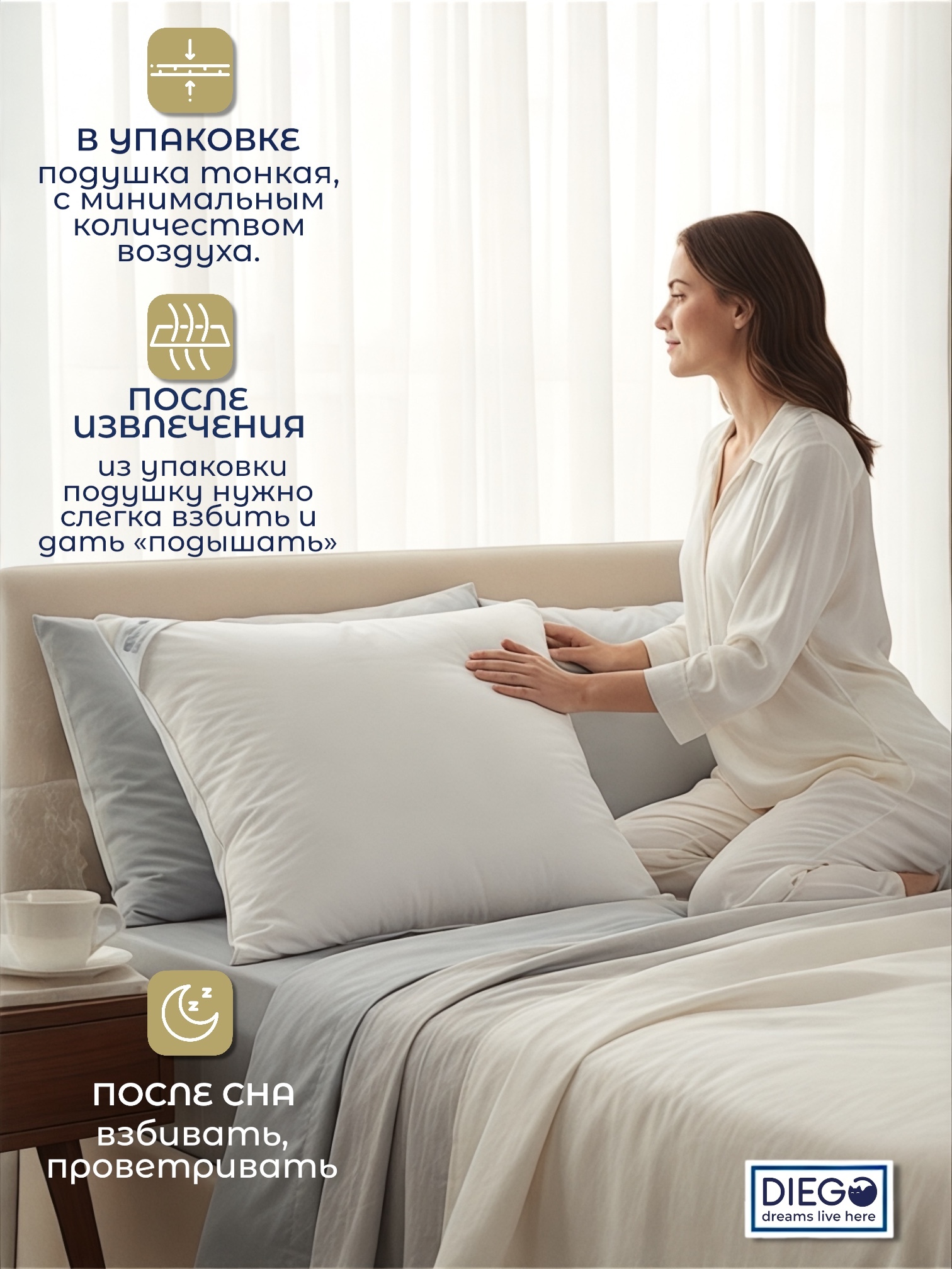 После сна рекомендуем встряхивать или взбивать Ваши одеяла или подушки, а также не заправлять Ваши постельные принадлежности на несколько часов, чтобы влага, которую они впитали за ночь могла испариться.