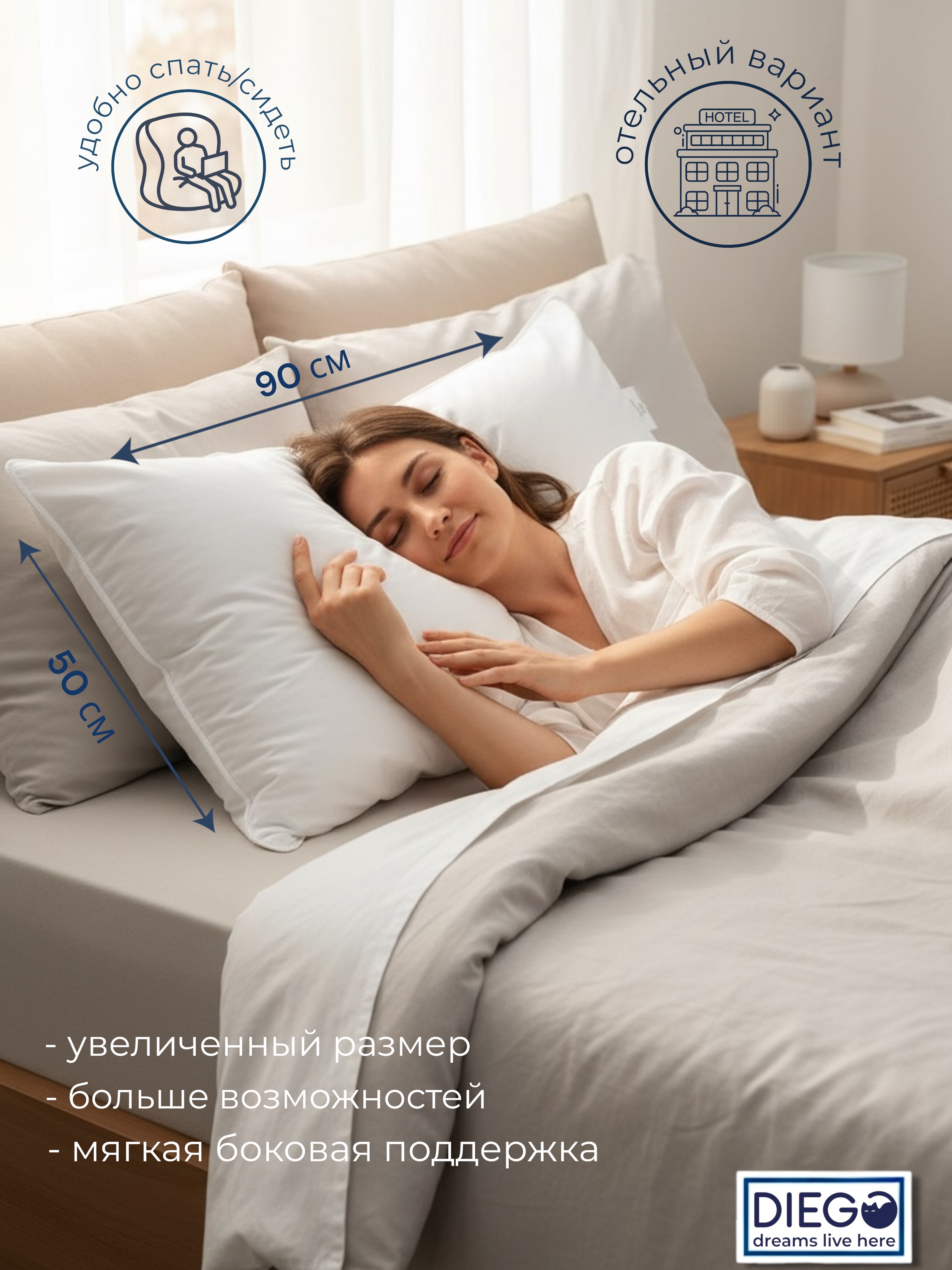 В коллекции Диана также представлены подушки удлинённой формы (отельный вариант) в размере 50*90. Данные подушки очень удобны для сна на боку, а также могут обеспечивать боковую поддержку тела.