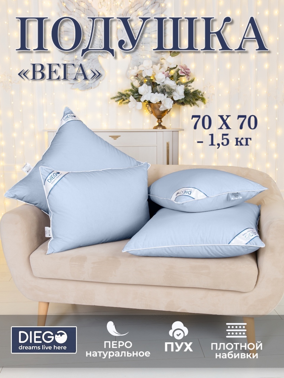 Подушки коллекции «Вега» — гусиный пух/перышко, средней жесткости, плотные